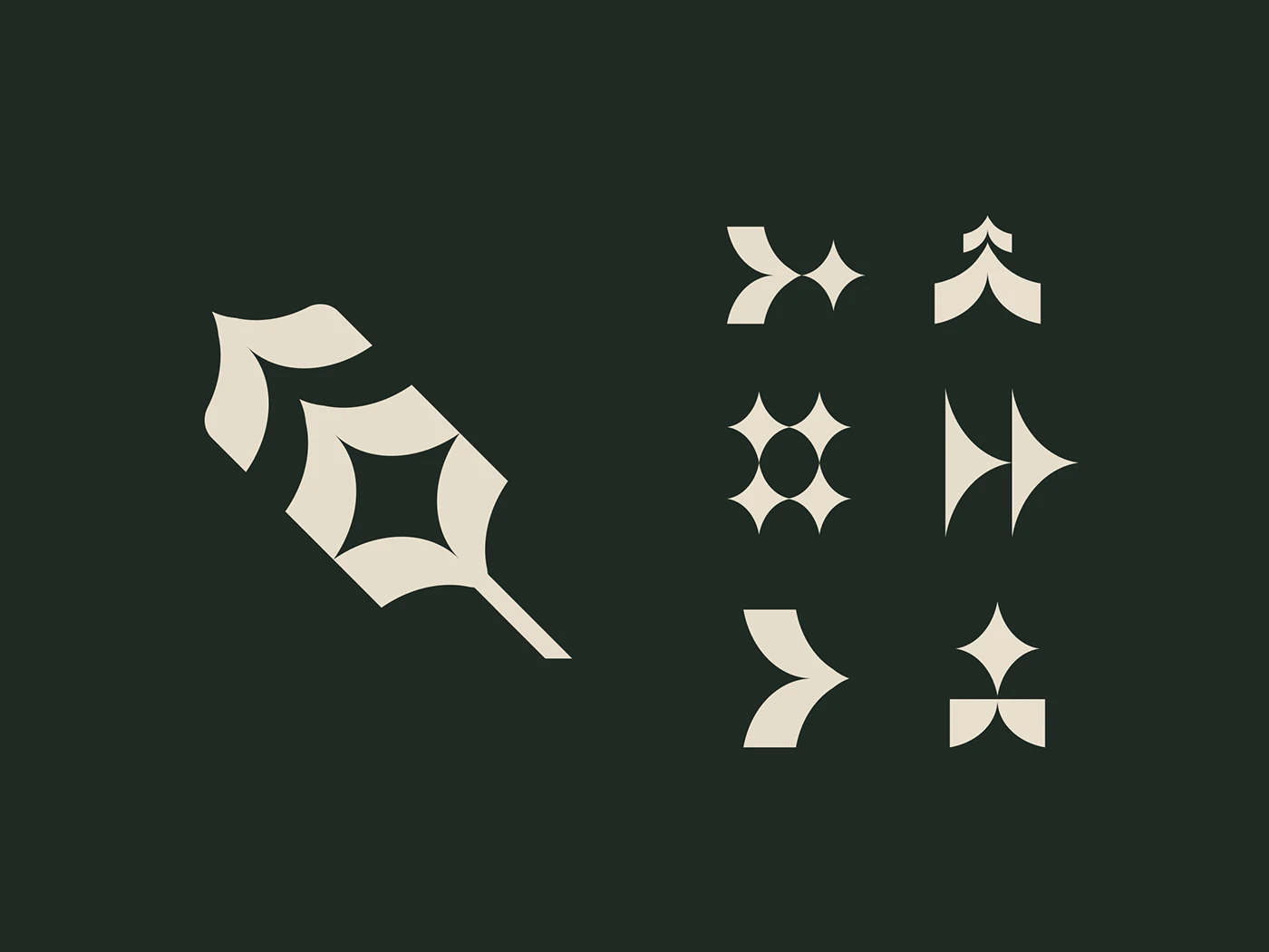 The logo mark is built from converging quill shapes, forming a sleek symbol that balances elegance and meaning. These motifs carry through the brand system, expanding into large abstract forms, forward arrows, and star-inspired visuals that support everything from digital content to presentations. The wordmark itself is custom-designed, weaving in subtle flourishes that echo the quill’s motion to create cohesion and flow.